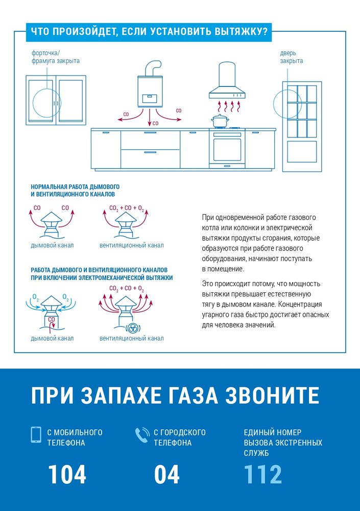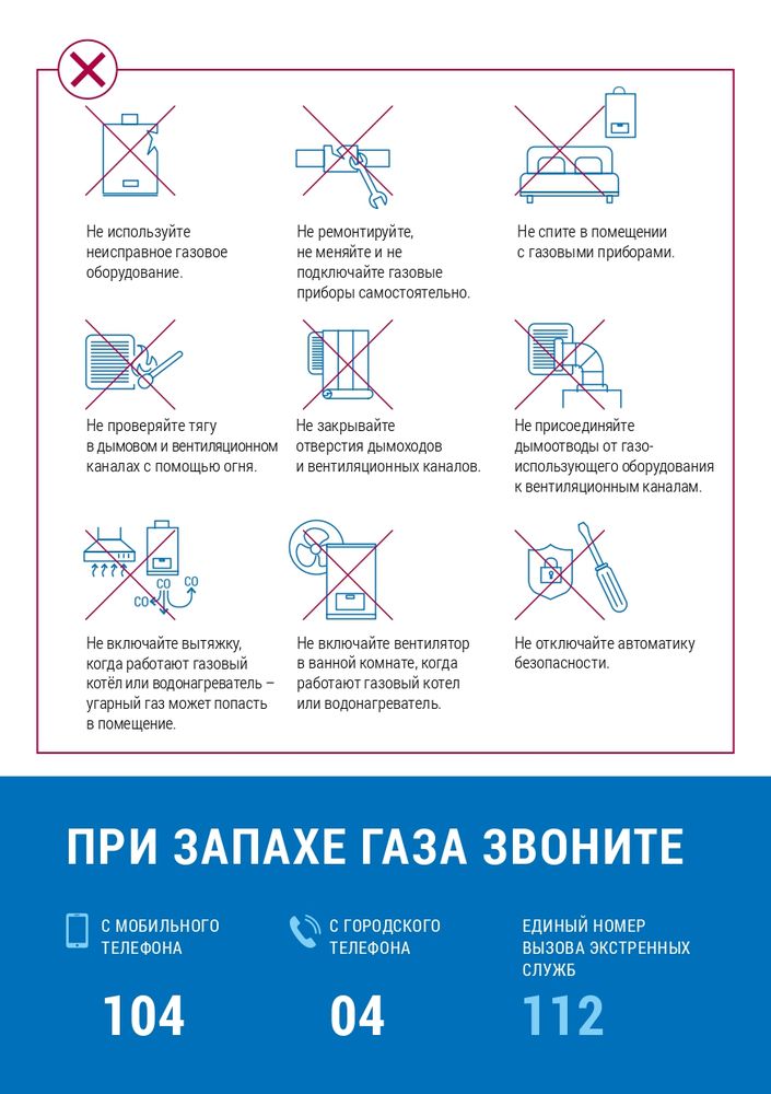 - не изменяйте конструкции газовых приборов, устройство дымовых и вентиляционных систем (не заклеивайте вентиляционные каналы);