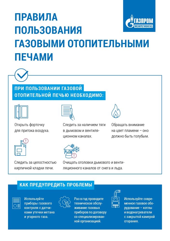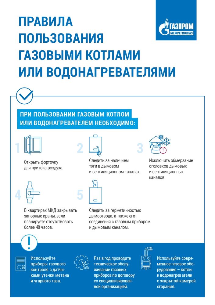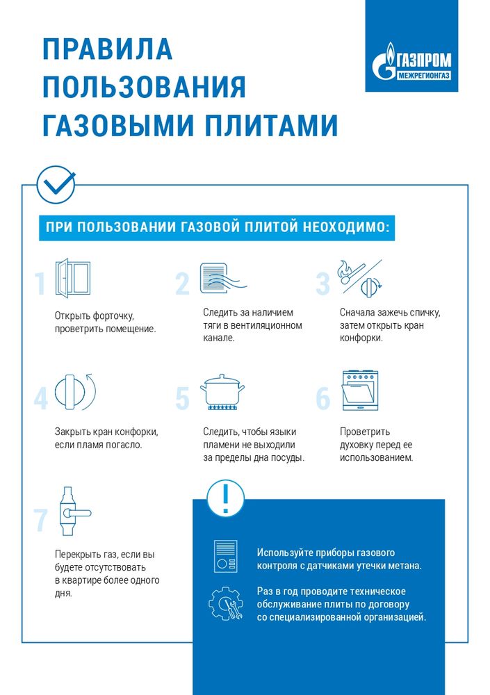 - своевременно проводите техническое обслуживание газового оборудования, проверку дымоходов и вентиляционных каналов;