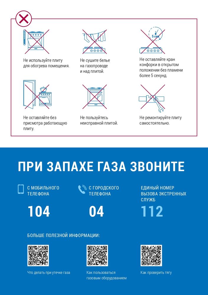 - не пользуйтесь газом при неисправных газовых приборах, автоматике, арматуре и газовых баллонах, особенно при обнаружении утечки газа;